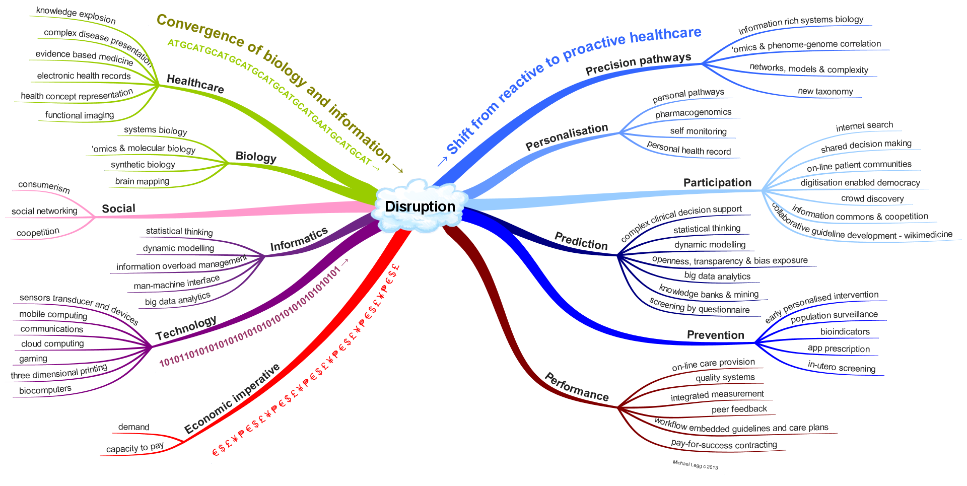 Convergence of trends in health care, biology, informatics and technology together with the associated social changes and economic imperative is driving a paradigm shift (2) that may be the answer. Informatics has a role in most aspects of this. The figure below provides a summary of the convergence of these trends and the likely results of disruption that will move us from reactive to proactive healthcare.
