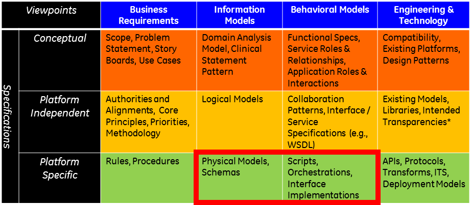 When considering the HL7 Services Aware Interoperability Framework (SAIF) icon, FHIR resources and RESTful APIs represent the “Physical Models” and “Interface Implementations” within the Platform Specific Specifications layer of the Information Models and the Behavioral Models Viewpoints, respectively.