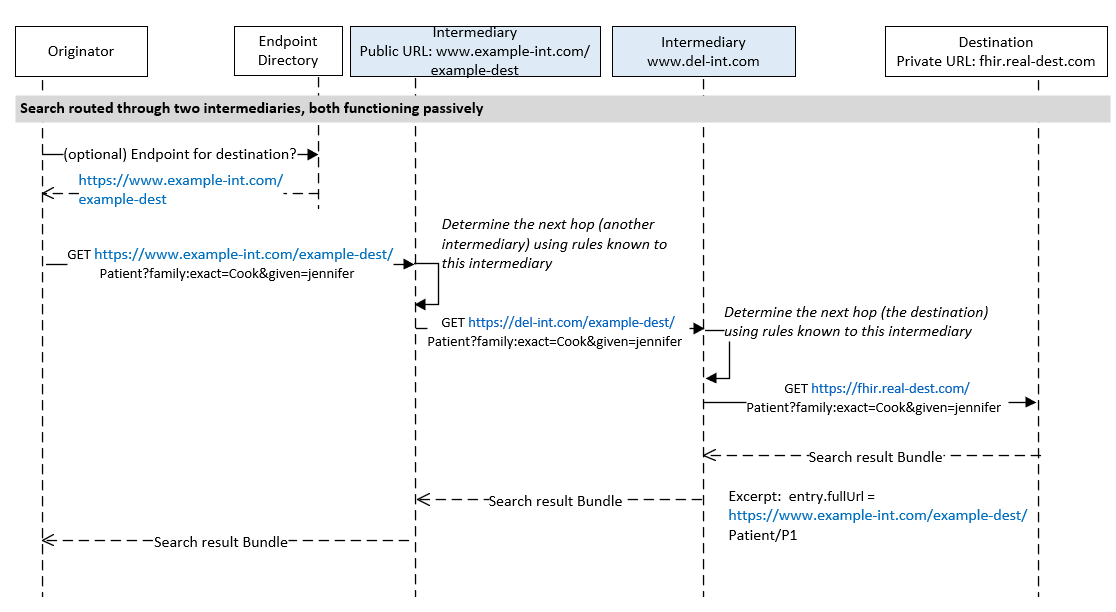 bcorp.int-one.net, fhir.int-one.net and fhir.d-corp.com to the intermediary's server, int-one.netfhir.d-corp.com is managed at d-corp.com's registrar and bcorp.int-one.net is managed at int-one.net's registrar)The destination and each delegated intermediary (participating in exchange hops following the inbound gateway intermediary) defines the URL at which it accepts requests intended for the destination. Each party is free to determine the appropriate structure of the URL to meet its preferences and technical requirements, as described in the preceding section.