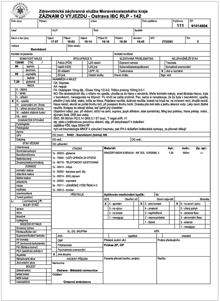 d) popis zdravotního stavu pacienta a poskytnuté péče,