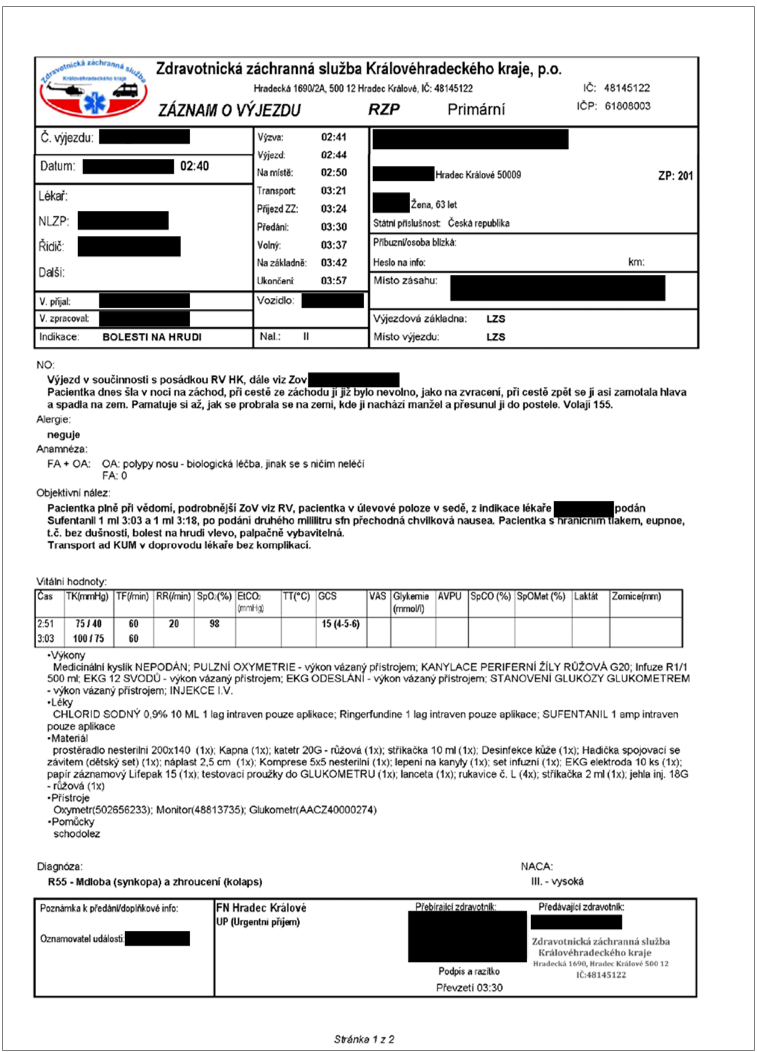Obr. 2: Tisková sestava výjezdové zprávy vytvořené v systému EZD (První strana)
