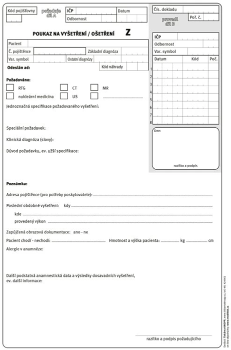 Papírovým vzorem pro elektronickou žádanku je papírová žádanka Poukazu na vyšetření/ošetření typu Z. Specifikace obsahu papírové žádanky uvádí příloha č. 1 v části 2 k vyhlášce č. 444/2024 Sb., o zdravotnické dokumentaci, k 19.2.2025 je znění následující: