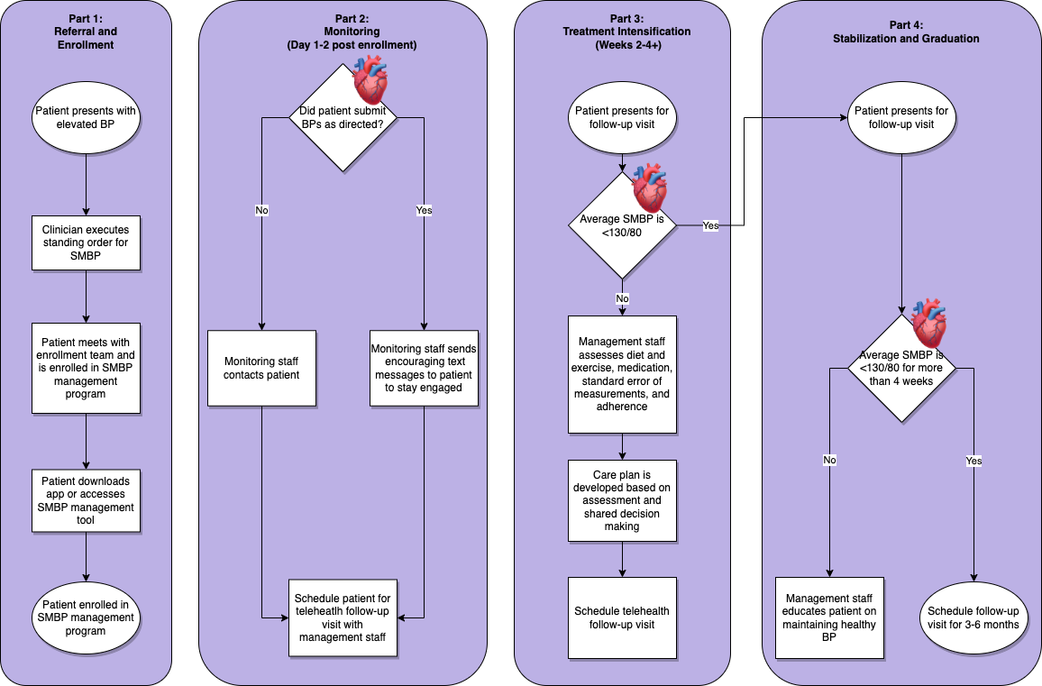 Hypertension management is multifaceted and may include antihypertensive medications, lifestyle modifications, and self-measured blood pressure monitoring (SMBP). SMBP, also known as home blood pressure monitoring, is an evidence-based strategy that has been shown to improve medication adherence, reduce therapeutic inertia, and improve blood pressure control. Multiple domestic and international guidelines call for its use in confirming new diagnoses of hypertension and to monitor therapeutic changes until blood pressure control is achieved. Optimal SMBP monitoring includes the remote exchange of patient-generated blood pressure readings to their clinical team who can interpret readings and transmit back titration and/or lifestyle modification advice. Many federal initiatives and national organizations have been working towards widespread implementation of SMBP but barriers exist 3. Lack of interoperable health information technology has been identified as a consistent barrier to SMBP implementation. Interoperability standards are needed to capture and exchange data from patient-generated SMBP readings, the health system, and pertinent data intermediaries.