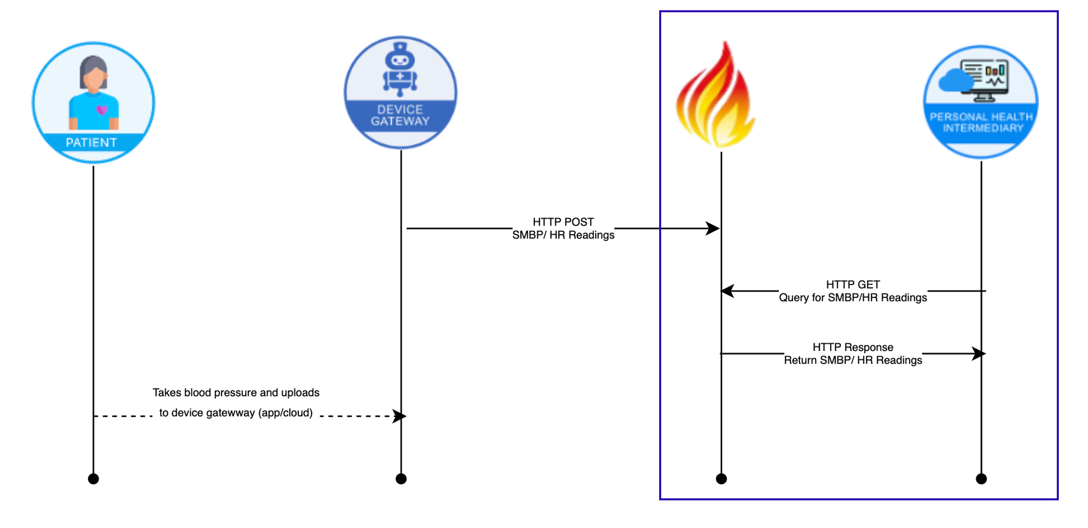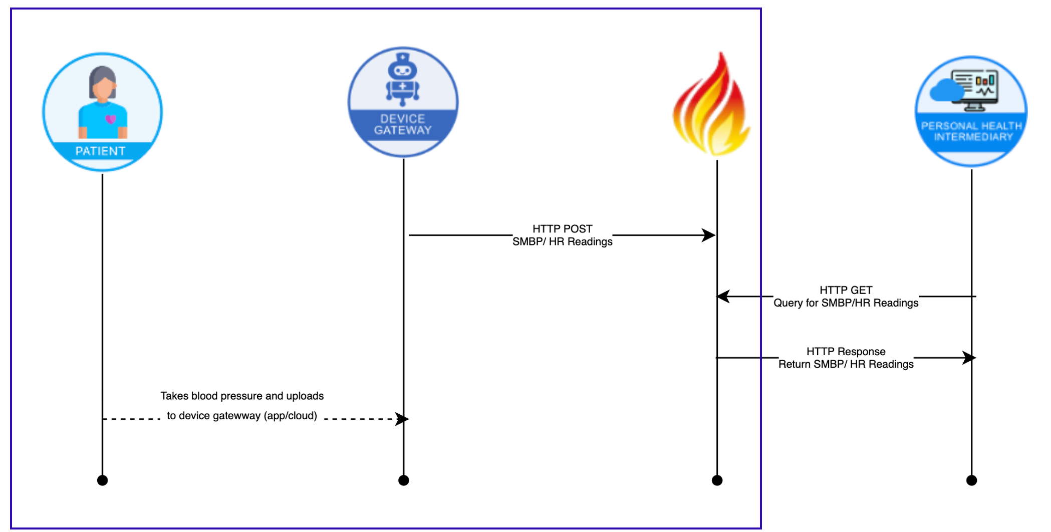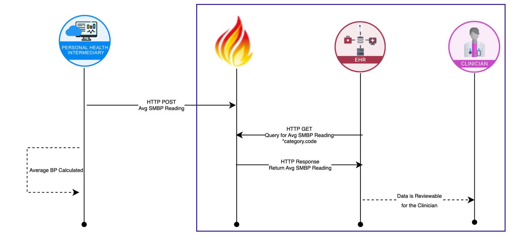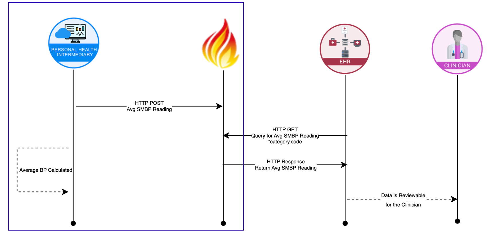 The Personal Health Intermediary calculates an average blood pressure reading based on the clinician’s instruction. The patient’s average self-measured blood pressure and the individual self-measured blood pressures that comprise the average are pushed, via a FHIR API to an EHR’s FHIR-enabled patient portal. The EHR performs a GET request to retrieve the average blood pressure and associated observations. The EHR shall be able to read, search, and create observations. Once the information has been retrieved, the EHR can store, share, reuse, and display the standardized information in their preferred view.