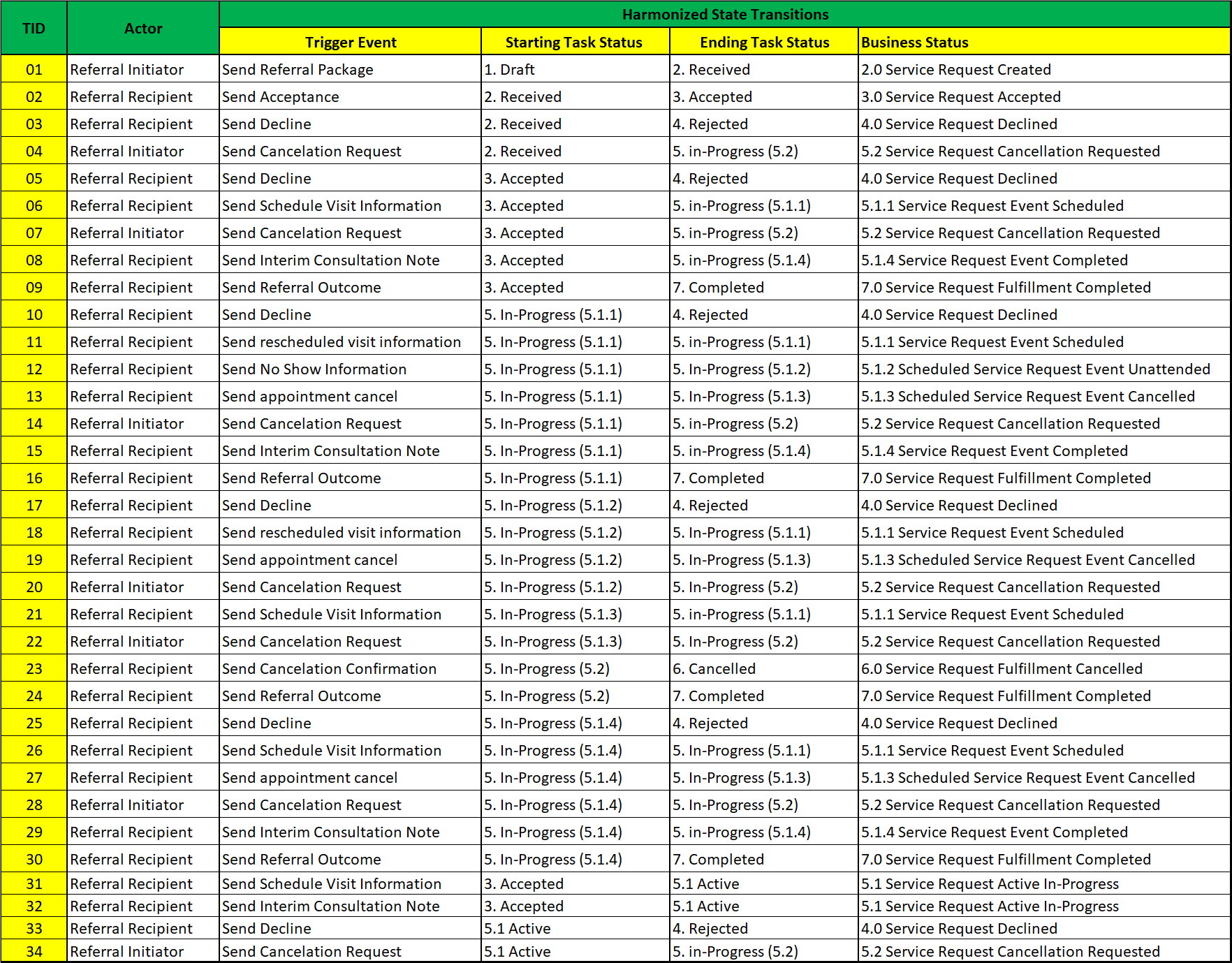 Actions taken by the referral initiator such as sending a BSeR Service Request (or the Service Request for a generic referral use case) or sending a cancellation request and actions taken by the referral recipient such as sending a referral acceptance or sending a ServiceRequest outcome are triggering events that trigger a change in state of the referral request Task. The full set of triggering events by actor and their corresponding state transitions are depicted in the following table: