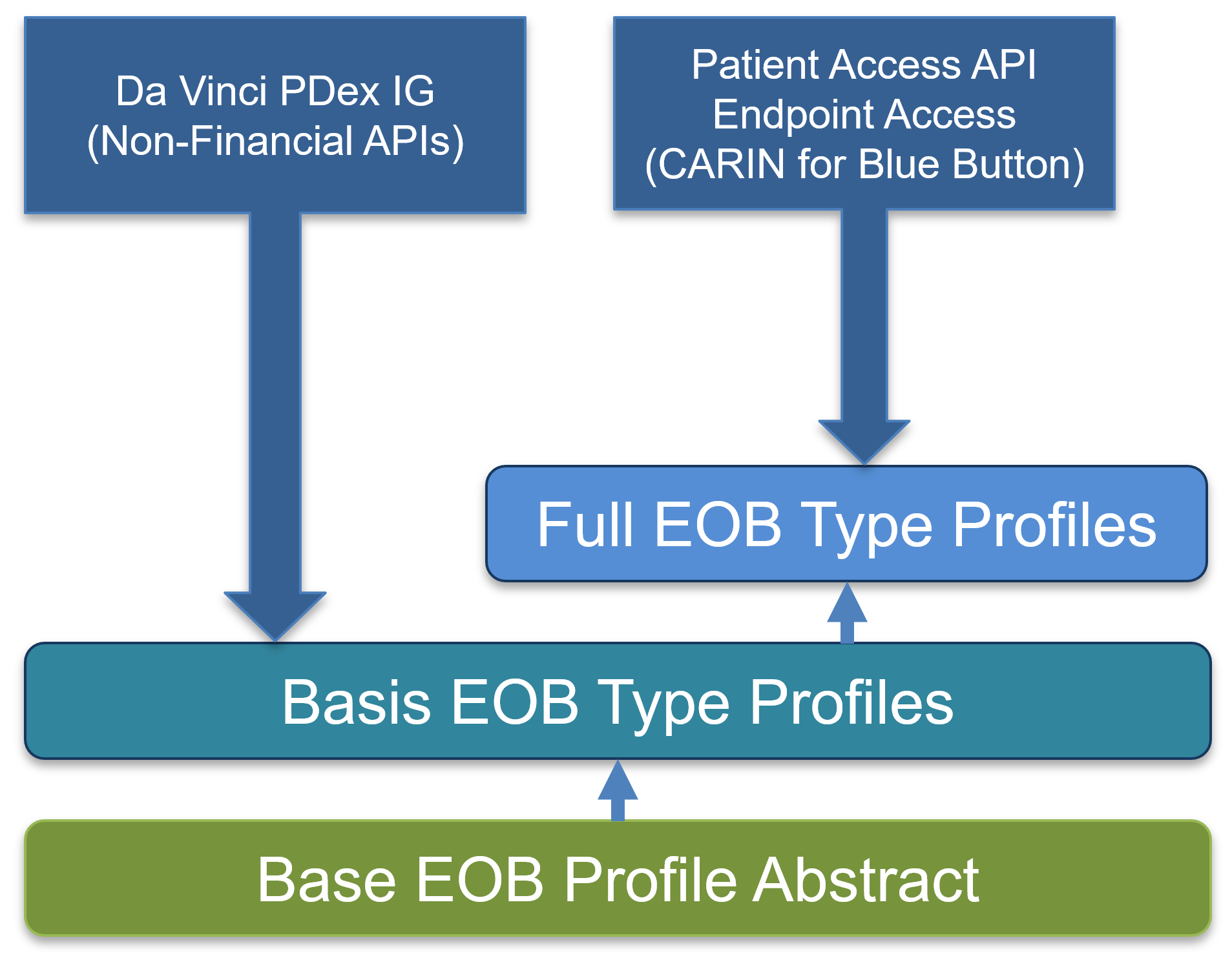 The below diagram shows the structure of the profiles in this IG and how they are anticipated to be used by the PDex IG where the “Basis” profiles contain all of the requirements for each type of EOB without financial data requirements and the Full EOB profiles to be used for consumer access.