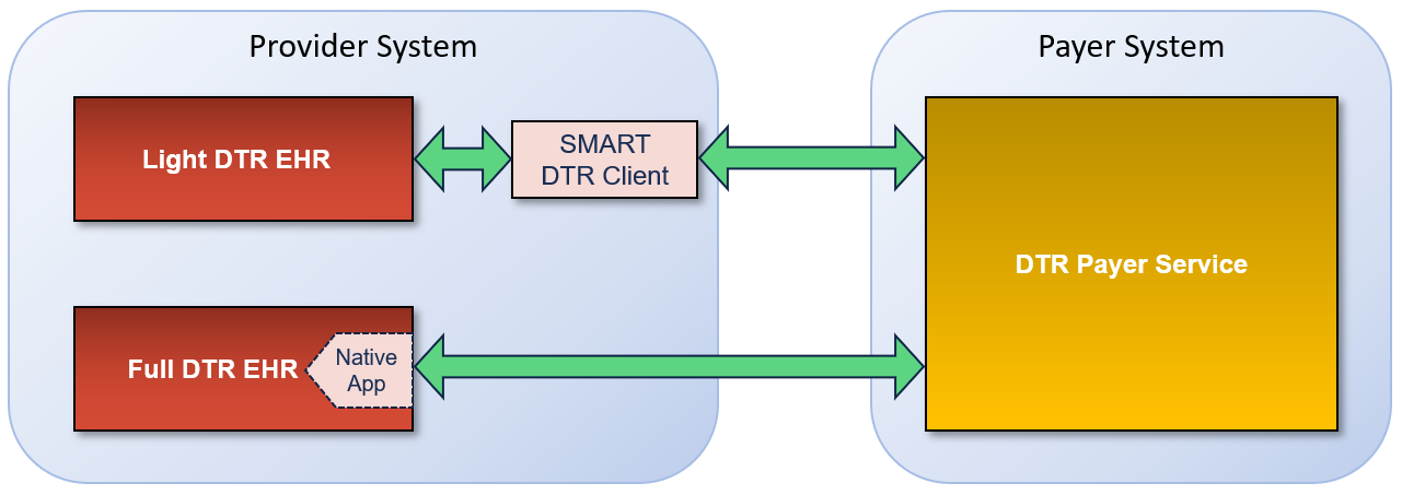 DTR leverages FHIR Questionnaires combined with embedded CQL logic and associated value sets to retrieve existing information, prompt for additional relevant information, and manage the logic process of determining which questions need to be answered (and what answer choices are relevant). The function of rendering these Questionnaires and capturing the information in patient-specific QuestionnaireResponses can occur either through SMART on FHIR applications or through functionality embedded directly into the EHR.