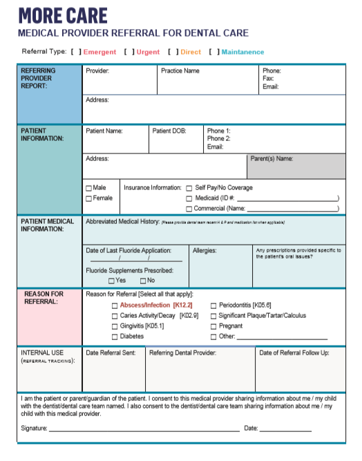 The Medical-Oral Expanded Care (MORE Care) referral forms are designed to establish a pathway of care communication that streamlines the scheduling process and closes the loop on a referral from a medical provider to dental providers. Above shows the MORE Care Medical Provider Referral for Dental Care, which was designed to facilitate the referral process, by ensuring that the receiving provider was given the essential health information for the referred patient.