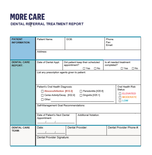 In the MORE Care pathway, dentists are asked to acknowledge acceptance of the referral, and following the referral treatment visit, complete the Dental Referral Treatment Report (above) to verify diagnosis, disease risk status, dental treatment summary, and patient recare schedule with the medical care team.