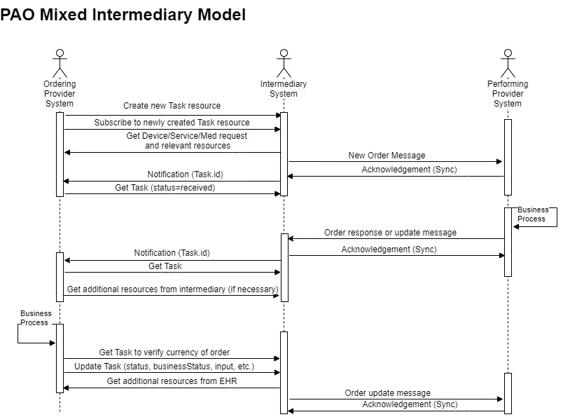 - The first part of creating the order includes the Intermediary getting all necessary resources from the Ordering Provider to package them as a message which is sent to the Rendering Provider. A successful message to the Rendering Provider is then reflected as a status of “received” in the Task resource, and the Ordering Provider is notified of the update.