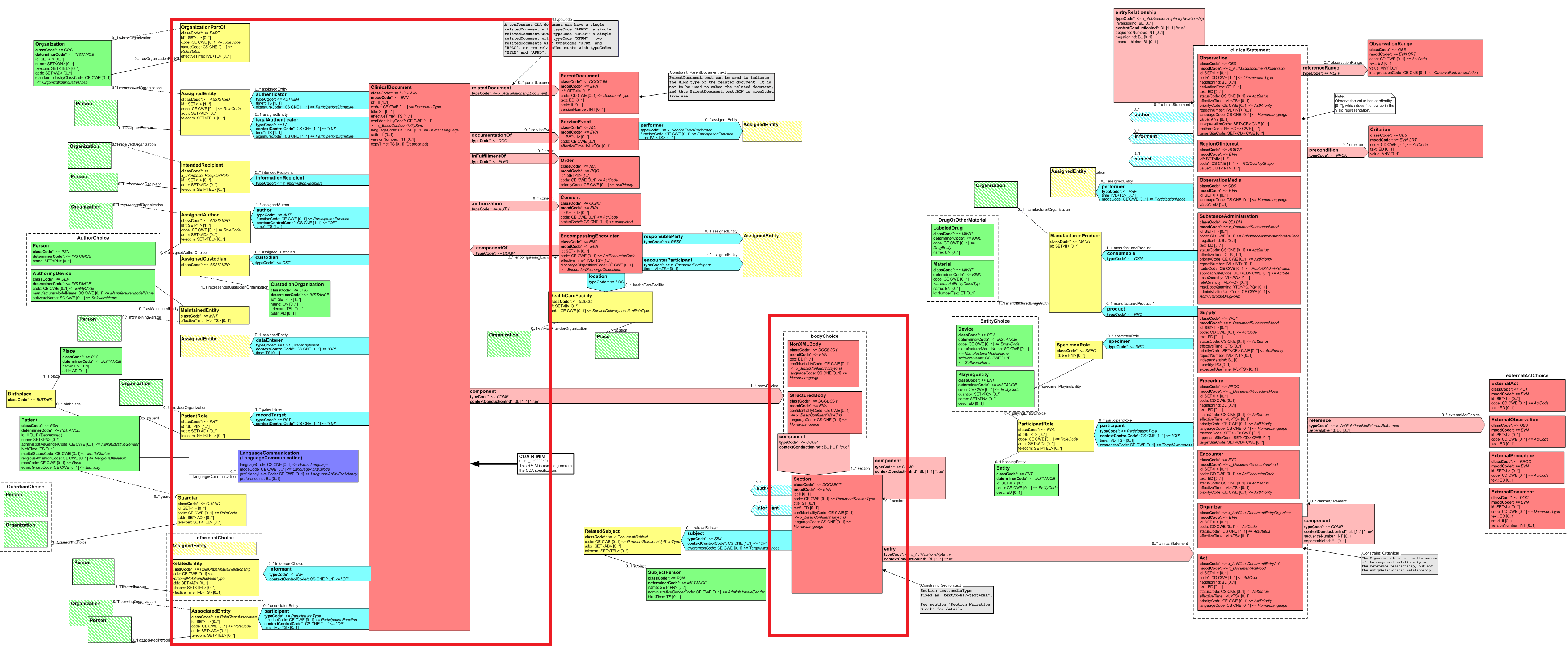 Scope for this version of the IG is limited to FHIR artifacts reflecting the CDA Header. More precisely, and as shown in the following figure within the red boxes, scope includes FHIR artifacts corresponding to: