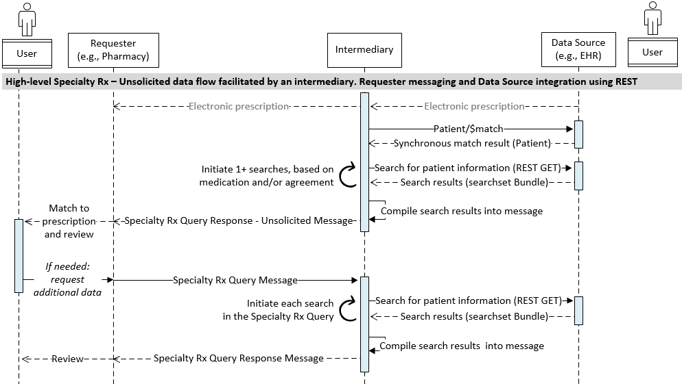 Likewise, an EHR that conforms with the Specialty Rx RESTful Data Source profile may leverage an intermediary so that it can fulfill query requests from messaging-based pharmacies and transmit “unsolicited” information related to prescriptions it sends to these pharmacies.