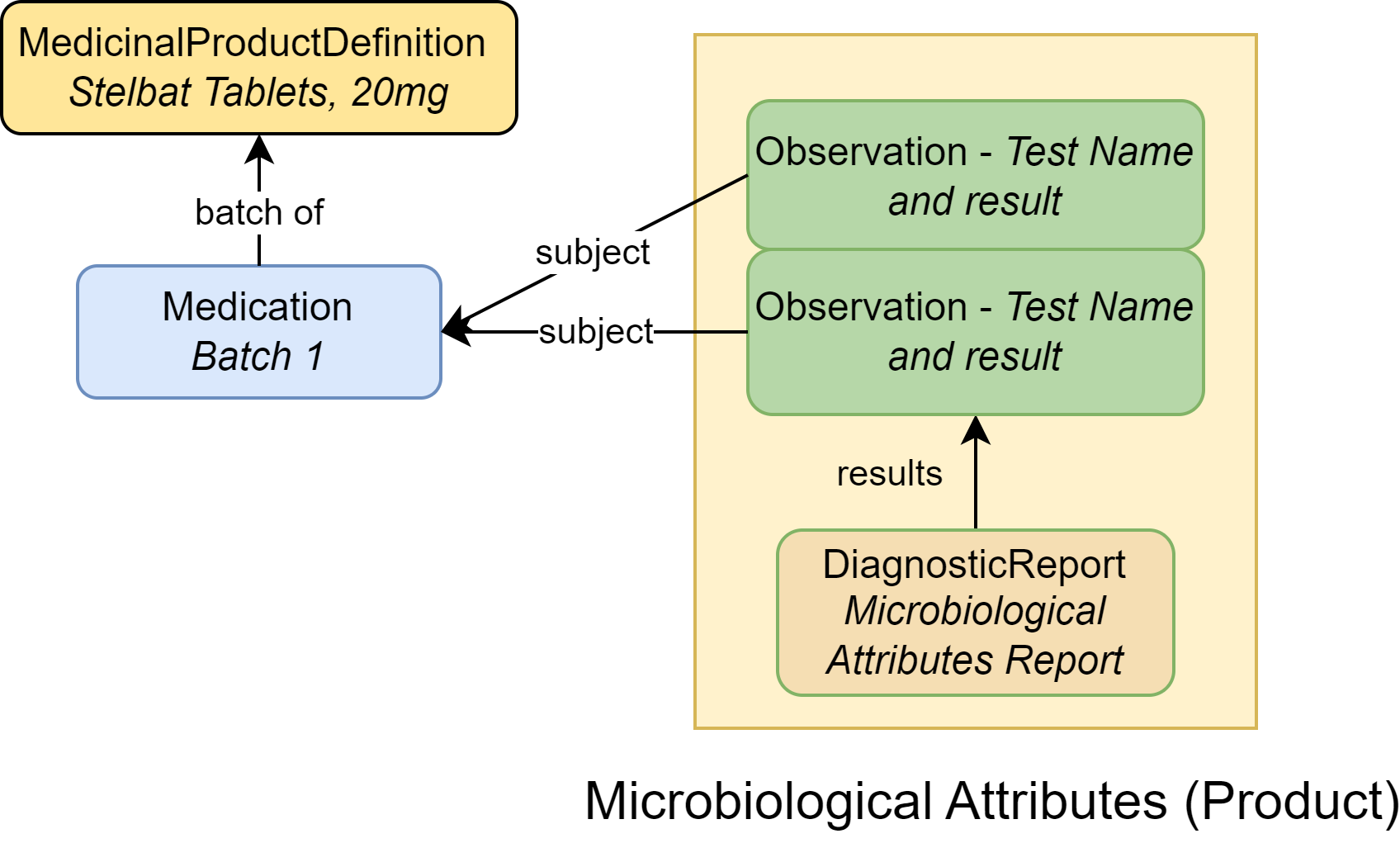 | DiagnosticReport | Contains all rest results as a group and captures conclusions |