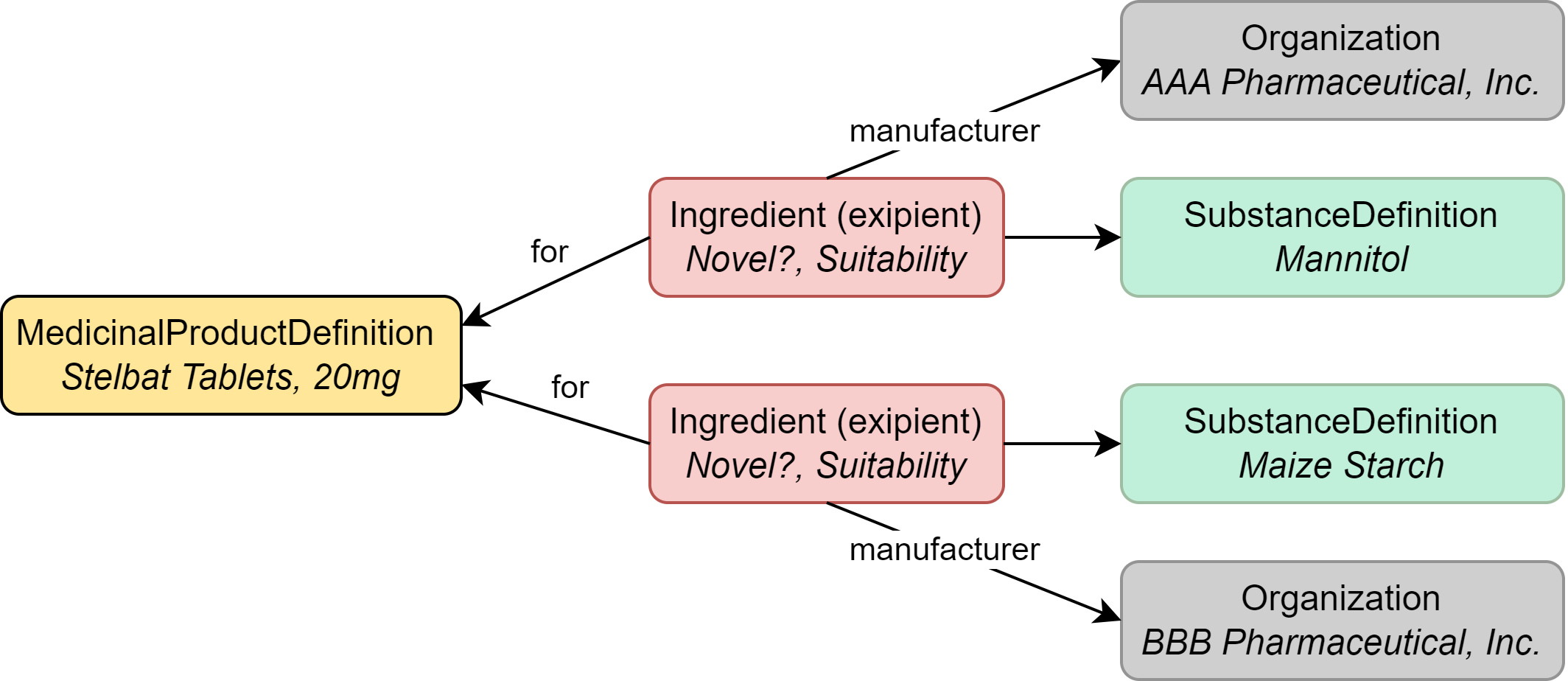 | MedicinalProductDefinition | The drug product (Stelbat tablets, 20mg) |