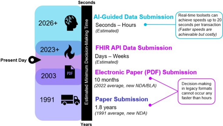 Figure: Advancement of the Submission and Decision-Making Ecosystems: The biopharmaceutical industry has undergone a previous transformation from paper-based submission to electronic paper submission. The industry is at the beginning of the next iteration of transformation, as signified by a transition to FHIR API data submission. This will be followed by further advancement as AI algorithms become increasingly prevalent. As the industry progresses in its journey towards digital maturity, faster submission and review processes will be made possible.