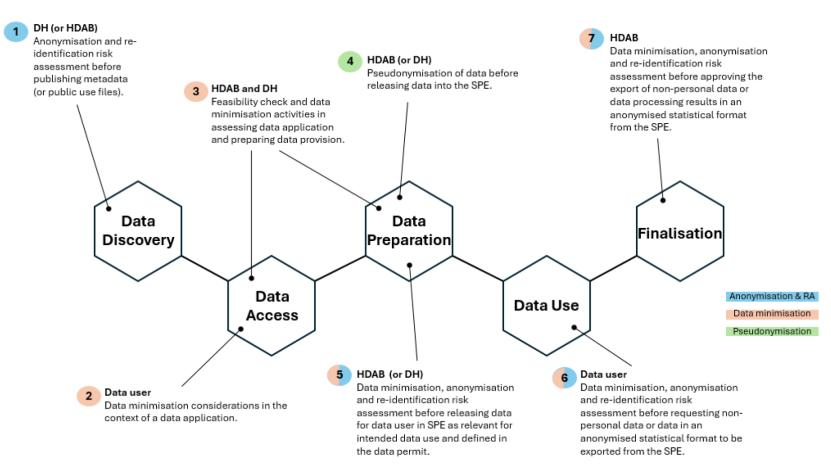 The following diagram from the EHDS2 M7.2 Draft guideline on data minimisation, pseudonymisation, anonymisation and synthetic data depicts the EHDS user journey for the full process, highlighting the areas within the process that address data minimization, pseudonymization and anonymization: