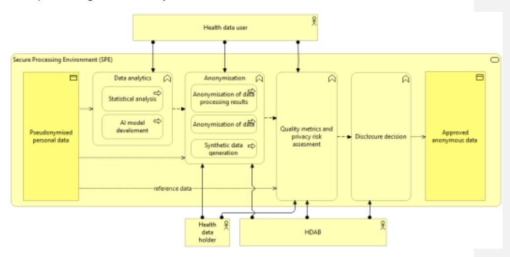 Once a Data Permit is granted, the third phase, Data Preparation, begins. The HDAB prepares the data set according to the permit content and de-identification to be applied. The EHDS2 M7.2 Draft guideline on data minimisation, pseudonymisation, anonymisation and synthetic data depicts a High-level architecture for safe disclosure of anonymized data, processing results, and synthetic data: