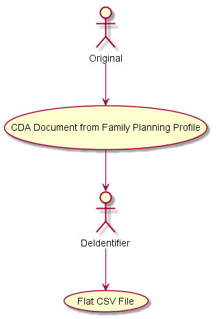 The De-Identification process involves consuming the original Family Planning CDA documents as inputs, and creating a new, De-Identified for Family Planning Comma Separated Value (CSV) file where each row in the CSV file corresponds to a de-Identified Family Planning CDA document.