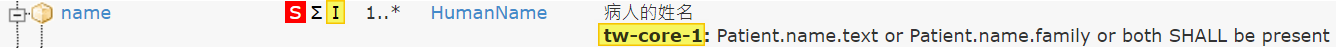 表示此資料項目受規範設定的限制(constraints)影響,例如:Patient.name的限制為「name.text(完整中文姓名)」或name.family(英文姓)或者兩者必須填寫」,詳可參閱Constraints。