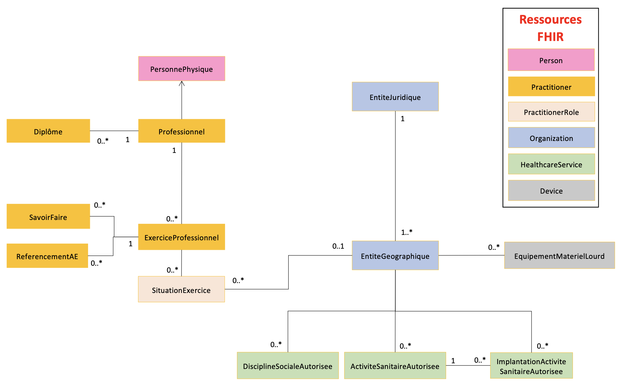Le schéma ci-dessous met en équivalence les deux concepts suivants : “Modèle des Objets de Santé”(MOS) géré par l’ANS et le concept des ressources FHIR de HL7