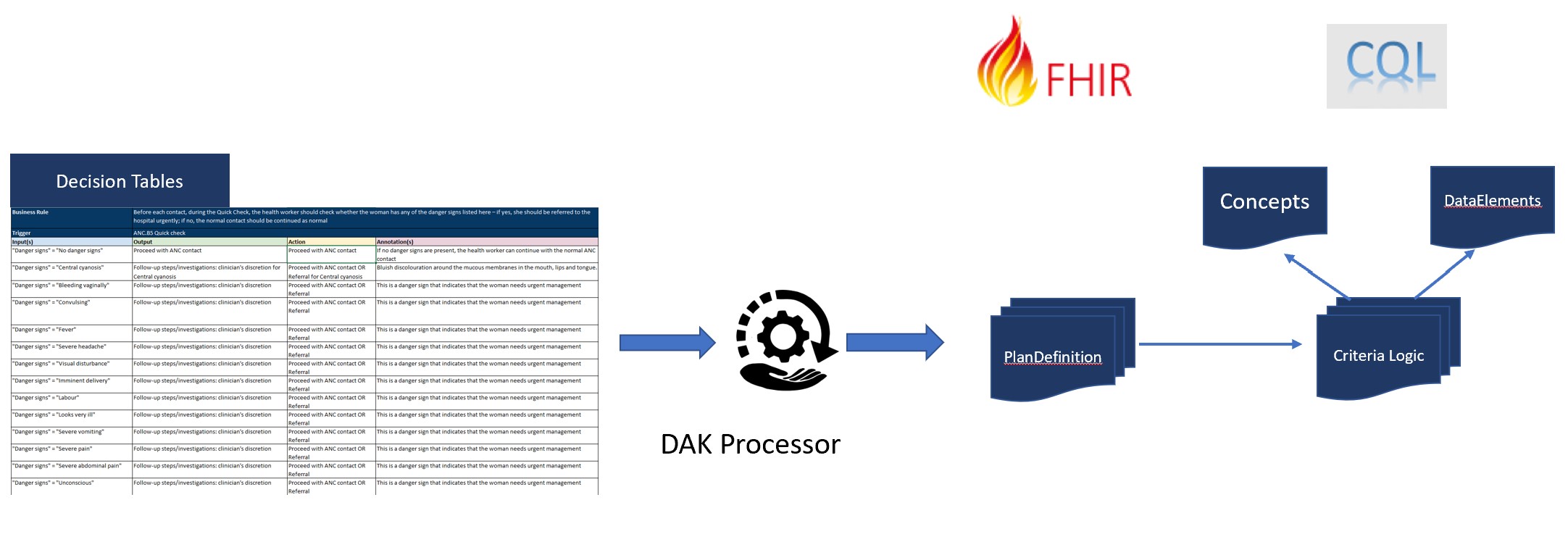 This implementation guide provides computable content based on the Digital Adaptation Kit (DAK) to facilitate the implementation of the WHO Antenatal care guidelines. The following diagram illustrates the components of a Digital Adaptation Kit and how those components are represented in FHIR: